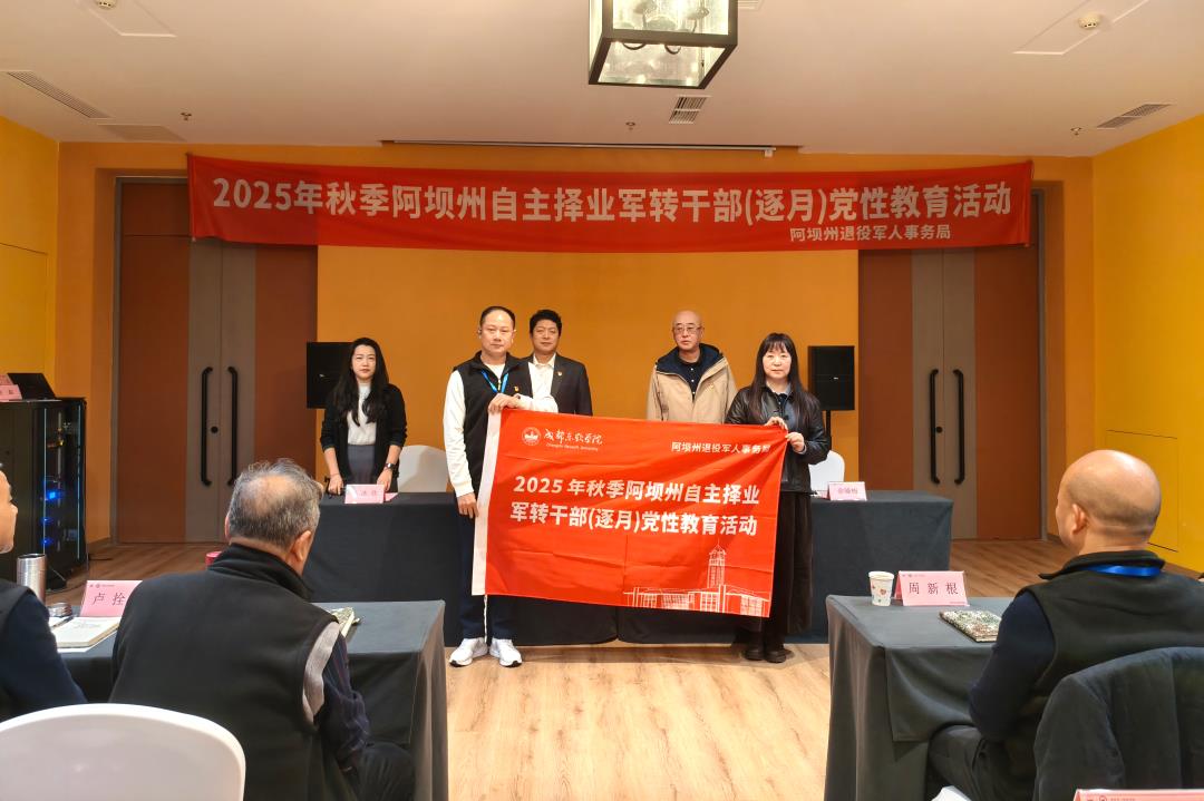 11月4日,2025年秋季阿坝州自主择业军转干部(逐月)党性教育活动(第二期)开班仪式在成都东软学院举行。出席本次开班仪式的领导有阿坝州退役军人事务局三级调研员牟刚、阿坝州退役军人事务局移交安置与就业创业科科长余晓梅,成都东软学院退役军人教育学院院长王雷,本次开班仪式由培训班带班老师石冰欣主持,共49名学员参加。